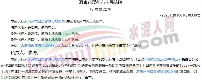 (2020)豫1081行審355號行政裁定書,準予執(zhí)行禹州市自然資源和規(guī)劃局對被執(zhí)行人禹州市錦信水泥有限公司磊磊石分公司作出的禹自規(guī)土監(jiān)罰決字[2020]第2-025號行政處罰,決定書載明第一條處罰限你單位十五日內拆除在非法占用的11556平方米土地上新建的一切建筑物及其他附屬設施,恢復土地原狀。由禹州市自然資源和規(guī)劃局組織實施。