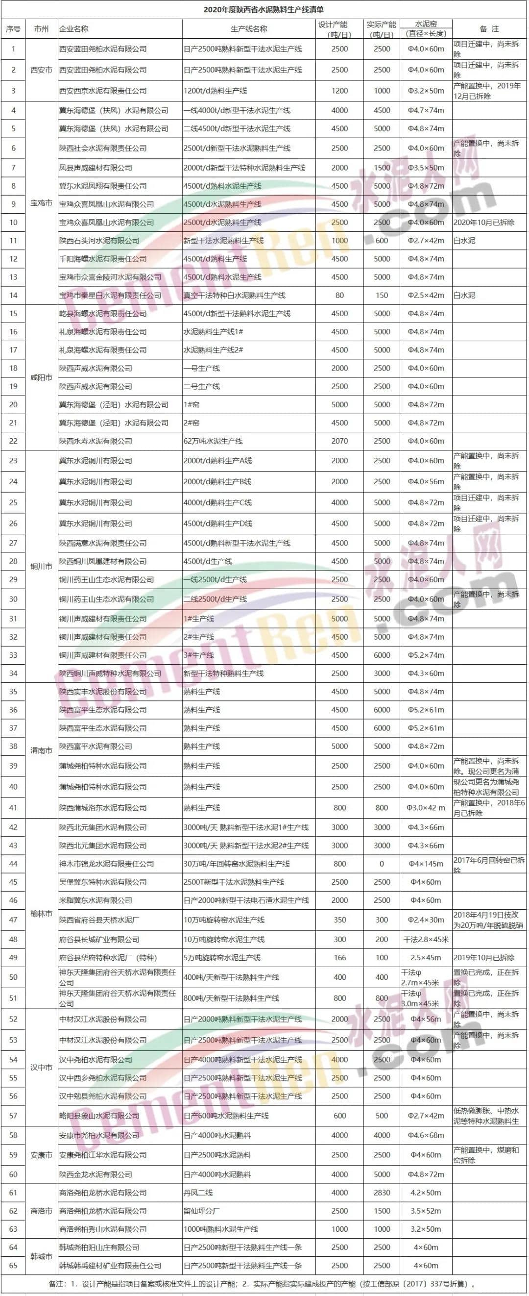 4月1日,陜西省工信廳發(fā)布《2020年度陜西省水泥熟料、平板玻璃、生產(chǎn)線清單》,公示清單中包括66個(gè)水泥熟料項(xiàng)目,年產(chǎn)能合計(jì)共5990萬噸/年,其中5條熟料生產(chǎn)線已拆除,2條熟料生產(chǎn)線正在拆除,11條熟料生產(chǎn)線正在拆除。