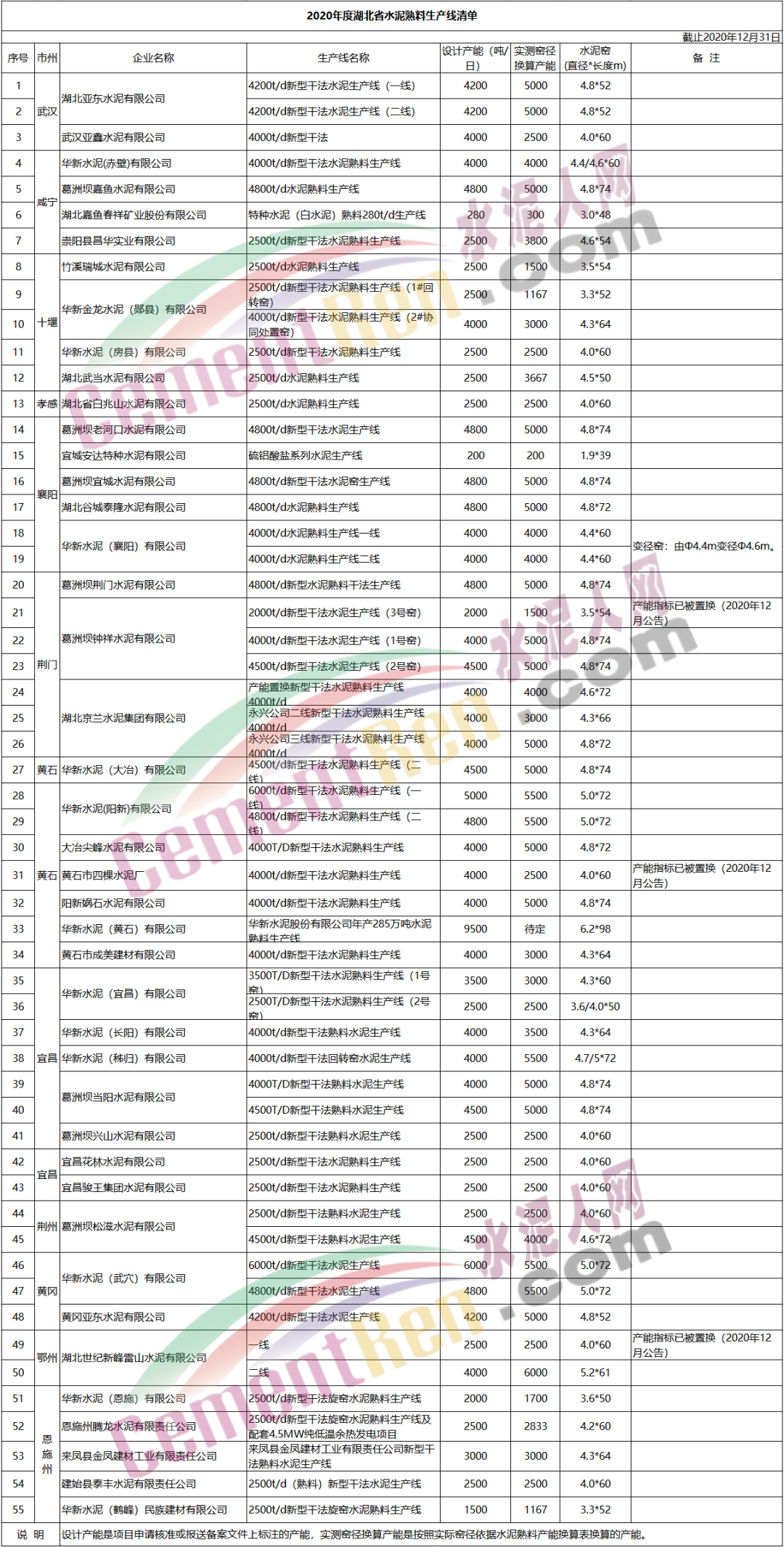 3月31日湖北省經(jīng)濟(jì)和信息化廳發(fā)布《關(guān)于2020年度全省水泥熟料平板玻璃生產(chǎn)線清單的公告》,公告中包括55個(gè)水泥公司,按窯徑計(jì)算總計(jì)共5920萬噸/年熟料產(chǎn)能,其中包括兩條2500t/d生產(chǎn)線和一兩條1500t/d熟料生產(chǎn)線已置換。