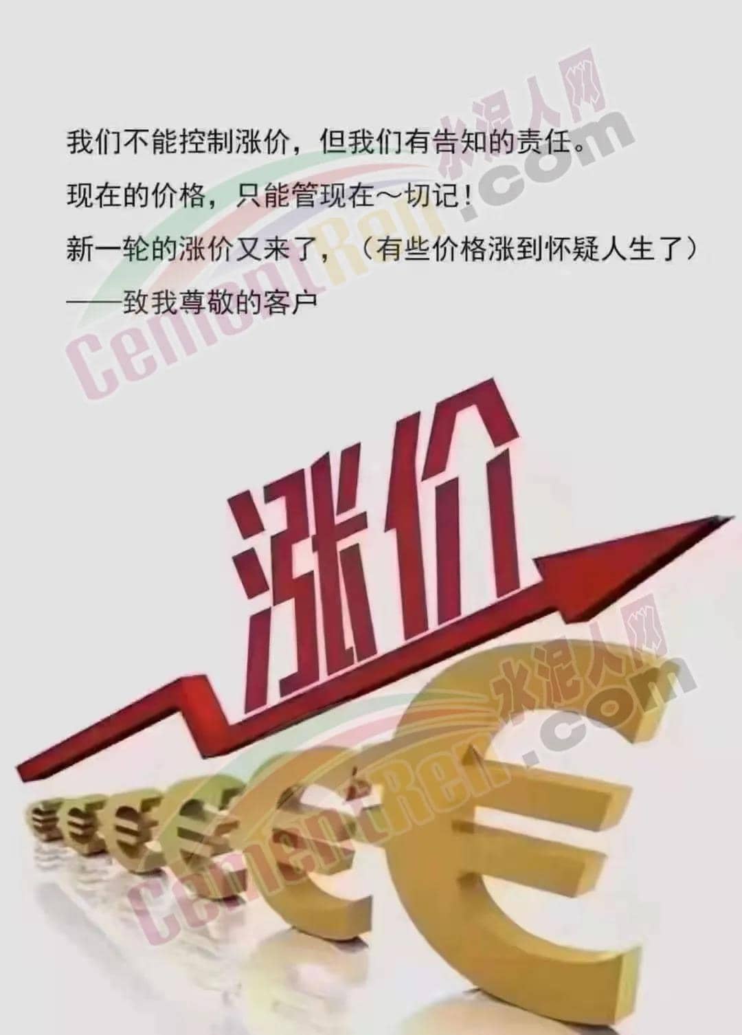 有水泥經(jīng)銷商發(fā)致客戶稱:“我們不能控制漲價(jià),但我們有告知的責(zé)任。現(xiàn)在的價(jià)格,只能管現(xiàn)在~切記!新一輪漲價(jià)又來了,有些價(jià)格漲到開始懷疑人生了!”