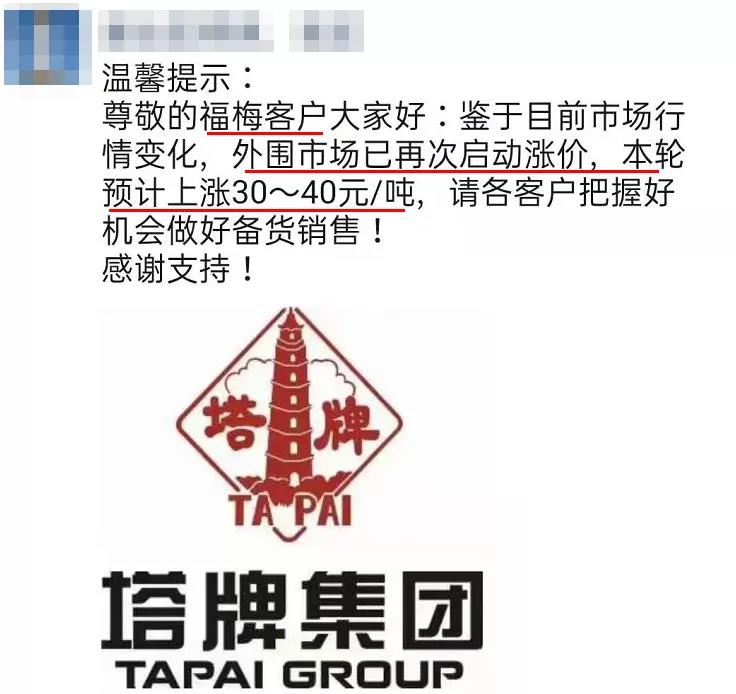 塔牌水泥經(jīng)銷商通知,鑒于目前市場行情變化 ,外圍市場已經(jīng)再次啟動(dòng)漲價(jià),本輪預(yù)計(jì)上漲30~40元/噸。