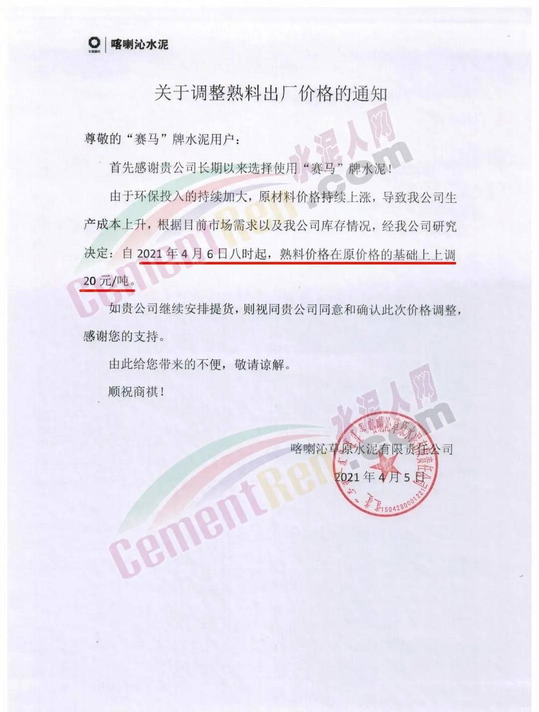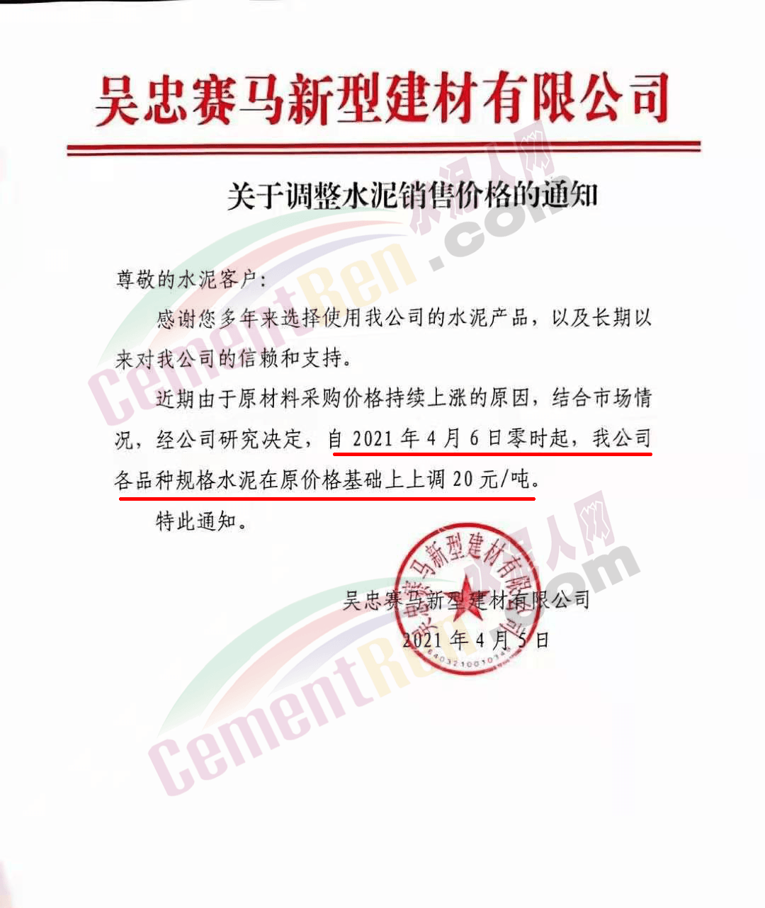 寧夏吳忠賽馬新型建材有限公司通知,由于原材料采購價(jià)格持續(xù)上漲的原因,結(jié)合市場情況,經(jīng)公司研究決定 ,自4月6日零時(shí)起,公司各品種規(guī)格水泥在原價(jià)基礎(chǔ)上上調(diào)20元/噸。