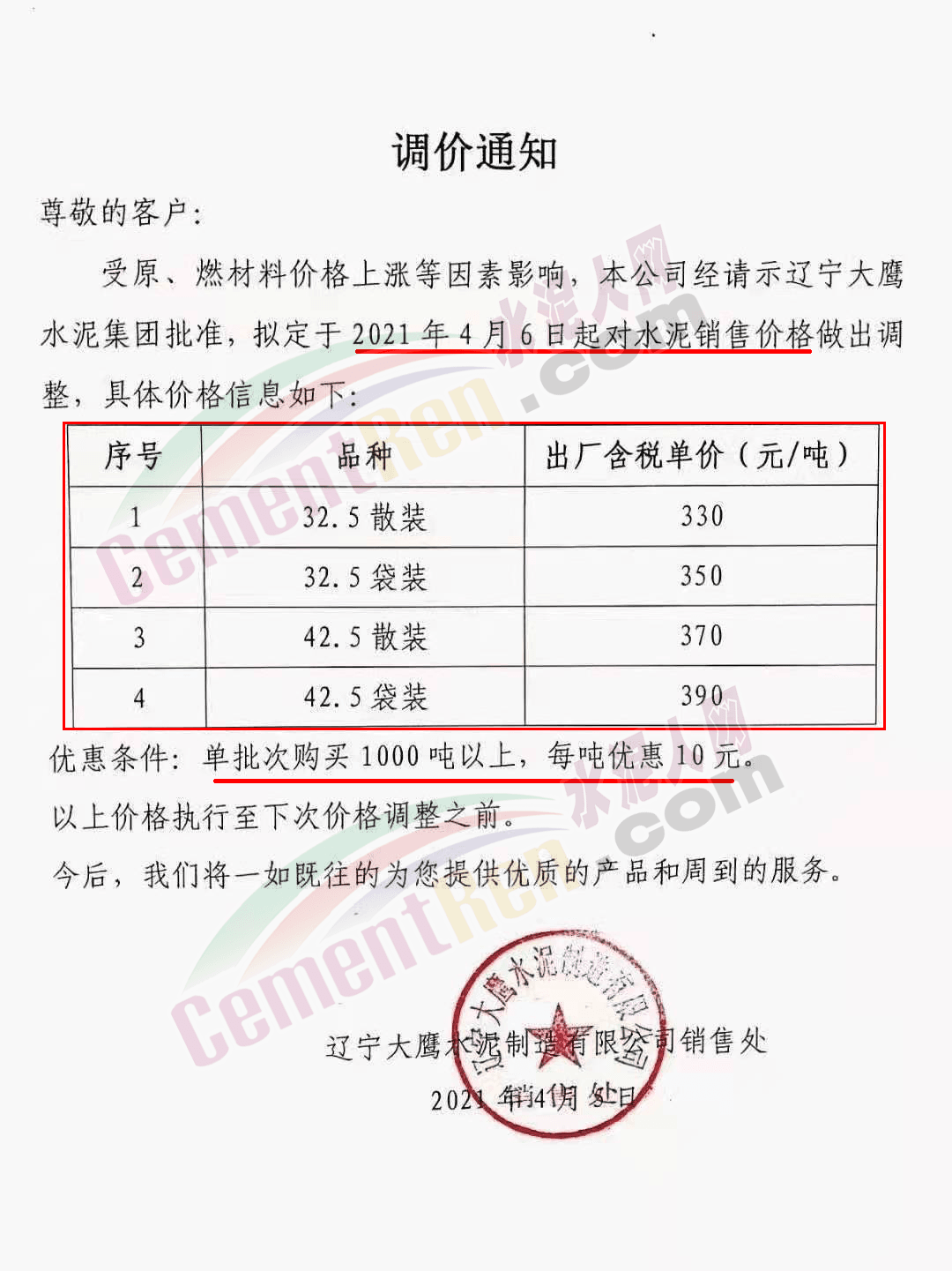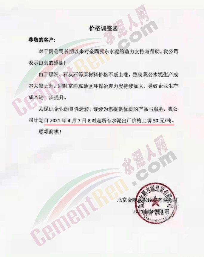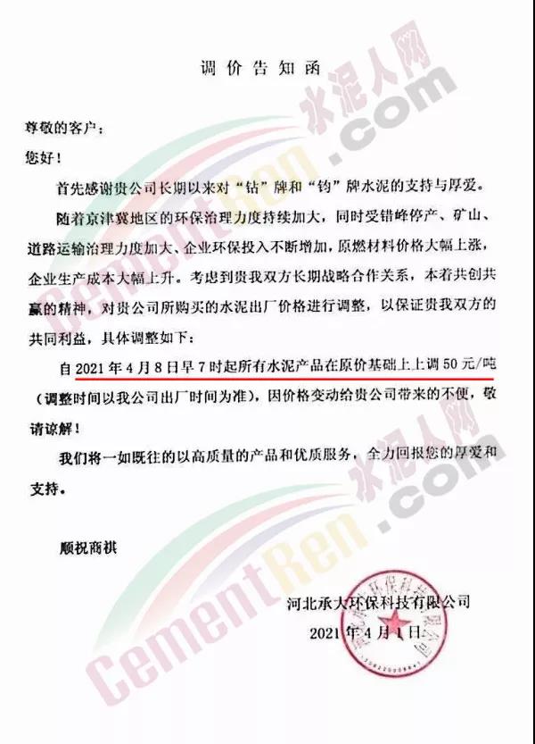 河北承大環(huán)保科技有限公司調(diào)價(jià)告知函稱,隨著京津冀地區(qū)的環(huán)保治理力度持續(xù)加大,同時(shí)受錯(cuò)峰停產(chǎn)、礦山、道路運(yùn)輸治理力度加大、企業(yè)環(huán)保投入不斷增加,原燃材料價(jià)格大幅上漲,企業(yè)生產(chǎn)成本大幅上升。自 2021年4 月8日早7時(shí)起所有水泥產(chǎn)品在原價(jià)基礎(chǔ)上上調(diào) 50 元/噸。