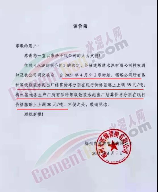 福州市塔牌營(yíng)銷公司通知自4 月9日零時(shí)起,福塔公司所有品種等級(jí)散裝水泥出廠結(jié)算價(jià)格分別在現(xiàn)行價(jià)格基礎(chǔ)上上調(diào) 35 元/噸,梅州基地各生產(chǎn)廠所有品種等級(jí)散裝水泥出廠結(jié)算價(jià)格分別在現(xiàn)行價(jià)格基礎(chǔ)上上調(diào) 30 元/噸。據(jù)水泥人網(wǎng)通訊反饋近期該企業(yè)已連續(xù)多次上調(diào)水泥價(jià)格,累計(jì)漲幅近100元/噸。
