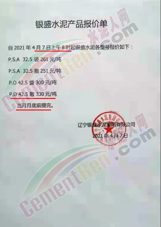 遼寧銀盛通知自4月7日上午8時(shí)起各型號(hào)執(zhí)行最新報(bào)告,其中P.O42.5散裝水泥報(bào)價(jià)330元/噸。且要求當(dāng)月月底前提完。據(jù)水泥人網(wǎng)通訊員反饋,當(dāng)日銀盛水泥廠門前出現(xiàn)了水泥車排隊(duì)提貨現(xiàn)象。