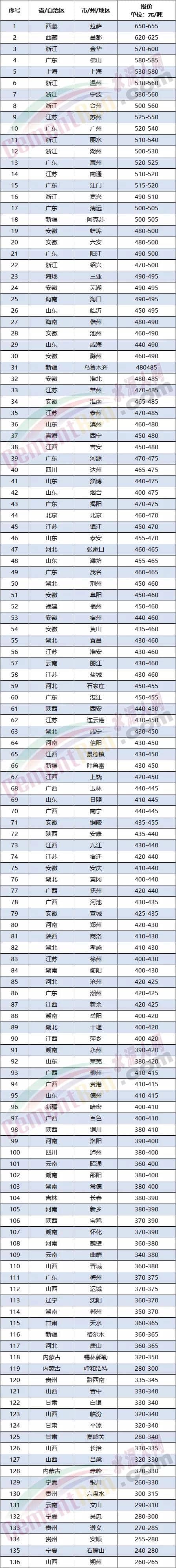 從水泥人網(wǎng)重點(diǎn)監(jiān)控的100多個(gè)區(qū)域報(bào)價(jià)來看各區(qū)域均價(jià)約在418.65~442.72元/噸之間,在400~500元/噸價(jià)格區(qū)間的區(qū)域約占60%以上。最高價(jià)仍在西藏高原地區(qū),昌都區(qū)域PO42.5散裝水泥報(bào)價(jià)達(dá)到620-625元/噸,處于第二位的是長(zhǎng)三角區(qū)域和珠三角區(qū)域,浙江金華報(bào)價(jià)已超600元/噸,廣東佛山目前報(bào)價(jià)與600元/噸也只差一張20元/噸的“漲價(jià)函”。從目前的行情趨勢(shì)來看,達(dá)到600元/噸也是指日可待。