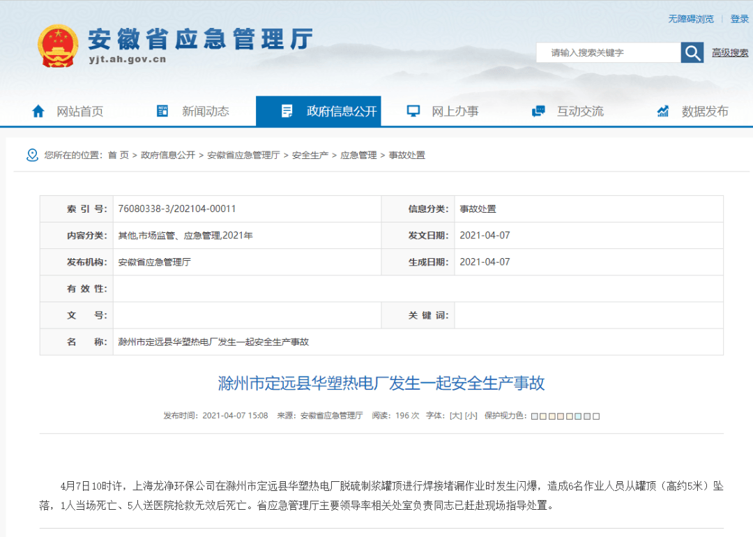 據(jù)安徽省應(yīng)急管理廳官網(wǎng)通報(bào),4月7日10時(shí)許,上海龍凈環(huán)保公司在滁州市定遠(yuǎn)縣華塑熱電廠脫硫制漿罐頂進(jìn)行焊接堵漏作業(yè)時(shí)發(fā)生閃爆,造成6名作業(yè)人員從罐頂(高約5米)墜落,1人當(dāng)場死亡、5人送醫(yī)院搶救無效后死亡。省應(yīng)急管理廳主要領(lǐng)導(dǎo)率相關(guān)處室負(fù)責(zé)同志已趕赴現(xiàn)場指導(dǎo)處置。