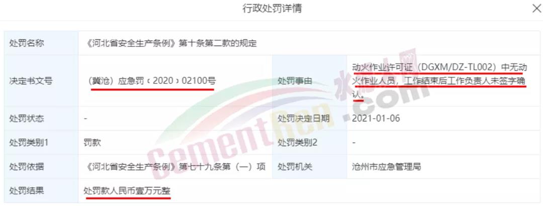 處罰決定日期:2021年1月6日;處罰結(jié)果:處罰款人民幣壹萬元整 ;處罰事由:動火作業(yè)許可證(DGXM/DZ-TL002)中無動火作業(yè)人員,工作結(jié)束后工作負(fù)責(zé)人未簽字確認(rèn)。