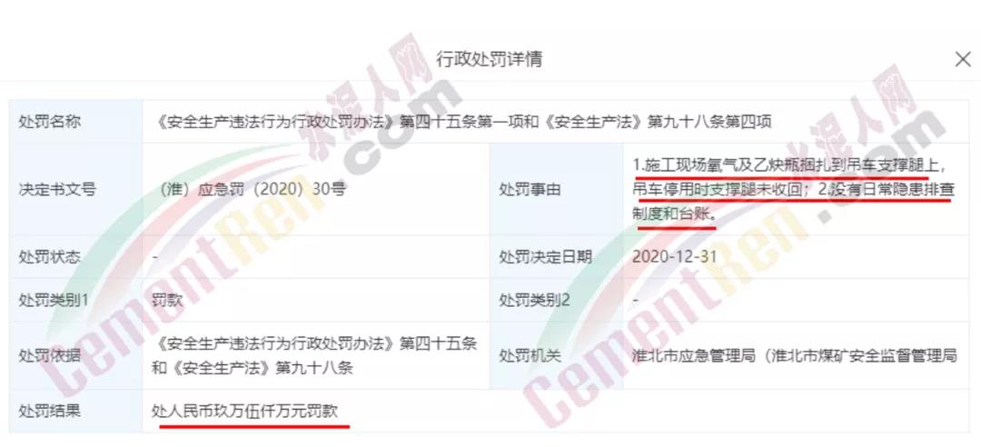 處罰日期:2020年12月31日;處罰結(jié)果:處人民幣玖萬伍仟萬元罰款;處罰事由:1.施工現(xiàn)場氧氣及乙炔瓶捆扎到吊車支撐腿上,吊車停用時(shí)支撐腿未收回;2.沒有日常隱患排查制度和臺賬。