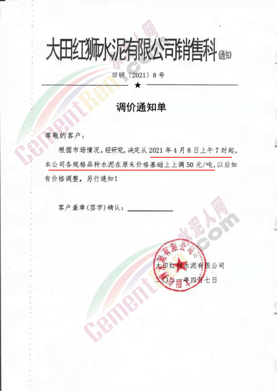 大田紅獅水泥通知自4月8日上午7時起,各規(guī)格品種水泥在原價基礎(chǔ)上上調(diào)50元/噸。