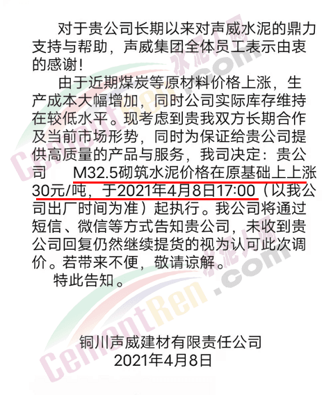 阿爾博波特蘭(安慶)公司通知鑒于自水泥生產(chǎn)使用的原、燃材料價格大幅度持續(xù)上漲,經(jīng)公司研究決定,自4月8日0時起,在北京、河北、黑龍江、吉林、遼寧、內(nèi)蒙古、山西、天津,對公司生產(chǎn)的P.W42.5級水泥在現(xiàn)行價格基礎(chǔ)上上調(diào)30元/噸,P.W32.5 級水泥和P.W52.5級水泥在現(xiàn)行價格基礎(chǔ)上上調(diào) 40 元/噸。