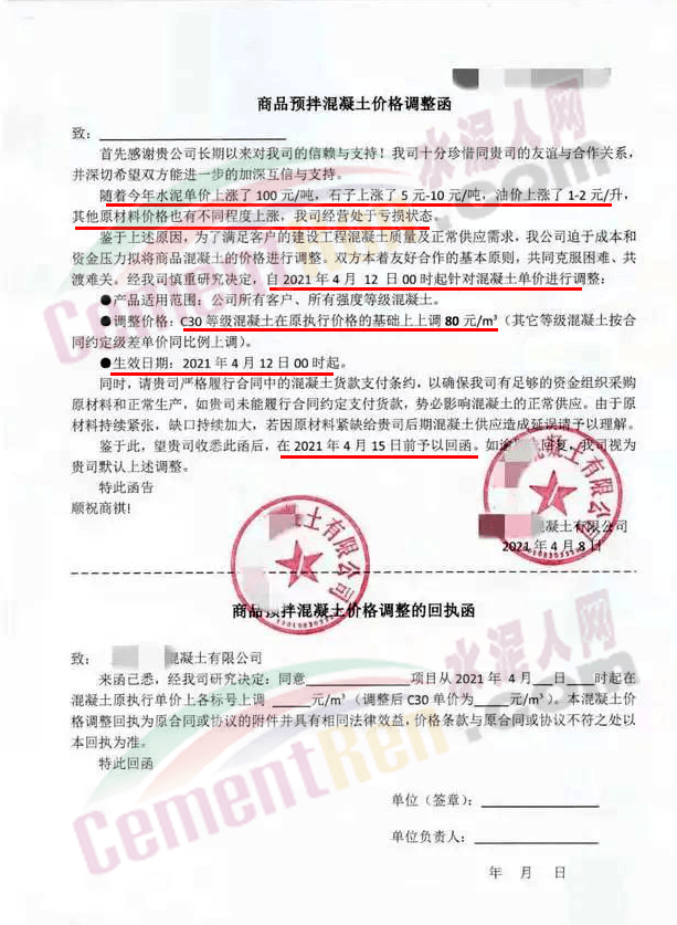 其中一家企業(yè)通知稱隨著今年水泥單價上漲了100元/噸,石子上漲了5 元-10元/噸,油價上漲了1-2元/升,其他原材料價格也有不同程度上漲,公司經(jīng)營處于虧損狀態(tài)。鑒于上述原因,為了滿足客戶的建設(shè)工程混凝土質(zhì)量及正常供應(yīng)需求。公司迫于成本和資金壓力擬將商品混凝土的價格進(jìn)行調(diào)整。雙方本著友好合作的基本原則,共同克服困難、共演難關(guān)。經(jīng)公司慎重研究決定,自 2021年4月 12 日 0時起針對混凝土單價進(jìn)行調(diào)整∶
