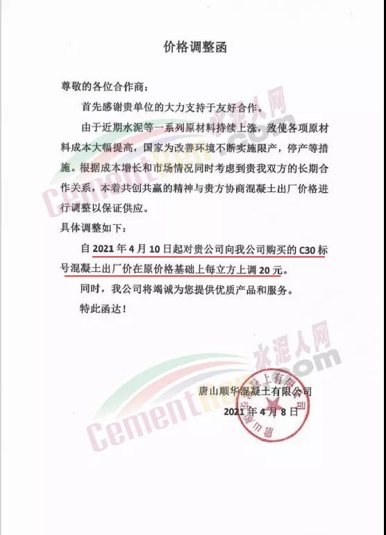 唐山順華混凝土有限公司通知,由于近期水泥等一系列原材料持續(xù)上漲,致使各項原材料成本大幅提高,自 4月 10 日起C30標(biāo)號混凝土出廠價在原價格基礎(chǔ)上每立方上調(diào)20元。