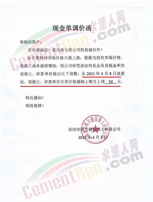 深圳市鴻力健混凝土有限公司通知由于原材料市場價格大幅上漲,混凝土成本逐漸增加,經(jīng)公司研究決定對各業(yè)務(wù)員現(xiàn)金單的混凝土、砂漿單價做出調(diào)整。從4月8日凌晨起混凝土、砂漿在原價基礎(chǔ)上上調(diào)50元/方。