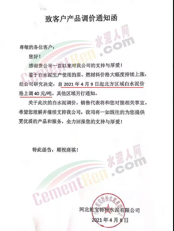 河北乾寶特種水泥通知,自4月9日起北方區(qū)域白水泥價格上調(diào)40元/噸。其他區(qū)域另行通知。