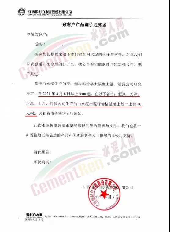 銀杉白水泥通知4月8日早9時起,北京、天津、河北、山西區(qū)域白水泥價格統(tǒng)一上調(diào)40元/噸。