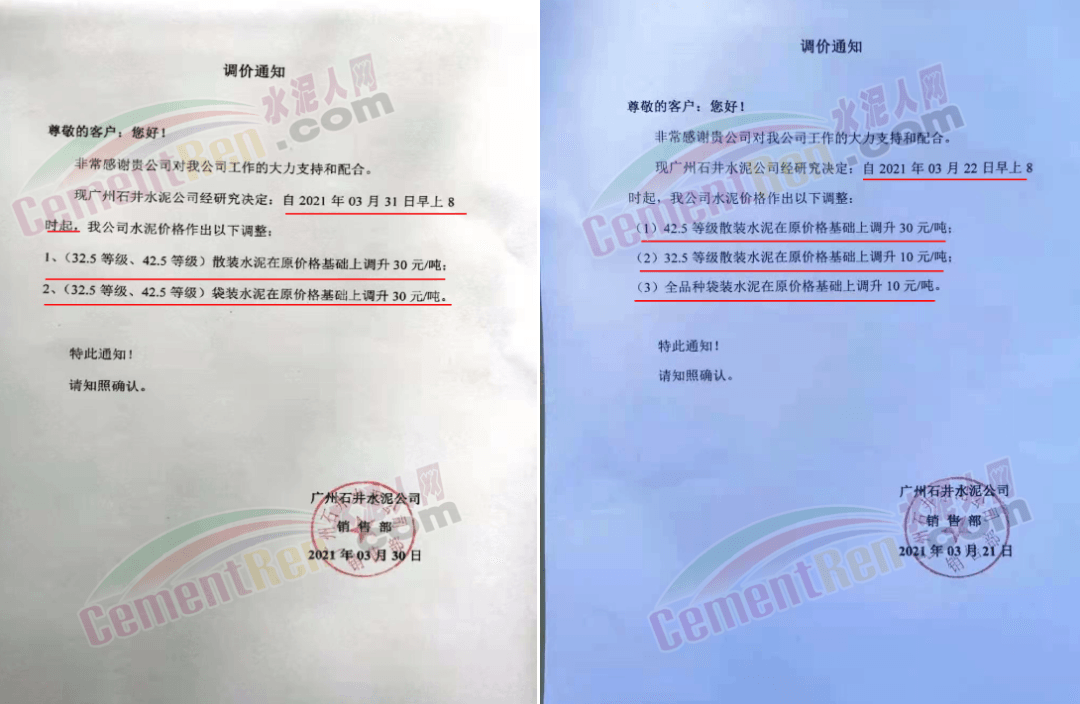 羅浮山水水泥集團(tuán)惠州國(guó)強(qiáng)水泥有限公司、博羅縣浮山水泥有限公司、惠州羅浮山旋窯水泥有限公司、惠州寶湖建材制造有限公司、惠州市惠陽雙新水泥有限公司等多家企業(yè)陸續(xù)通知上調(diào)各標(biāo)號(hào)水泥價(jià)格30元/噸。部分企業(yè)調(diào)價(jià)通知如下: