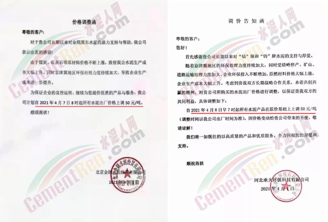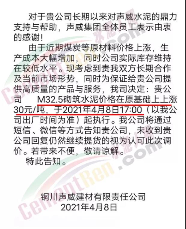4月10日,唐山弘也水泥有限公司通知由于環(huán)保力度的持續(xù)加大,水泥生產(chǎn)用熟料、水泥石、礦粉等材料價(jià)格大幅度上漲,致使生產(chǎn)成本提高。故公司根據(jù)水泥成本增長(zhǎng)及市場(chǎng)情況,自4月11日0時(shí)起所有水泥產(chǎn)品價(jià)格在原有的基礎(chǔ)上每噸上調(diào)30元。