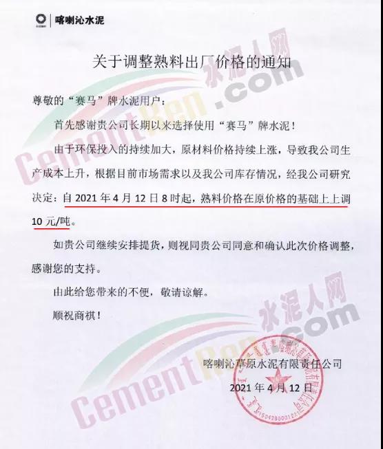 與此同時,多家特種水泥企業(yè)通知上調(diào)產(chǎn)品價格,其中白水泥價格上調(diào)30-100元/噸,熟料上漲100元/噸。