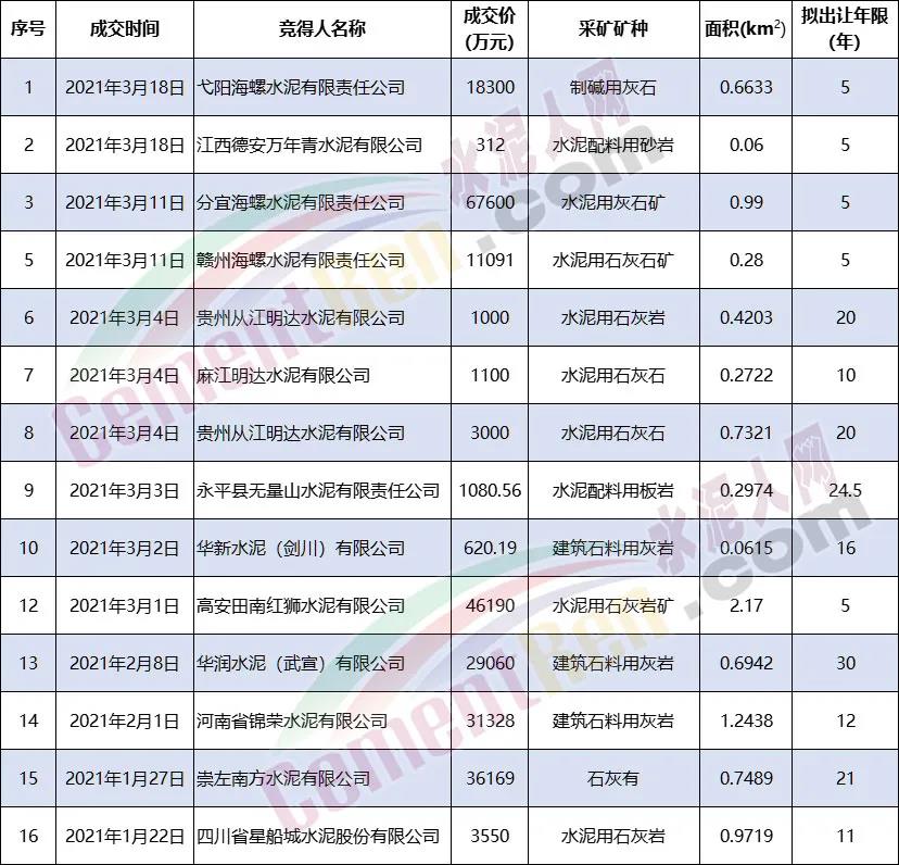 全國水泥行業(yè)礦山普查探礦權(quán)岀讓成交結(jié)果統(tǒng)計(jì)