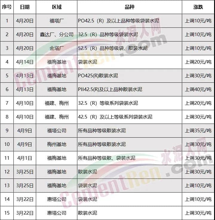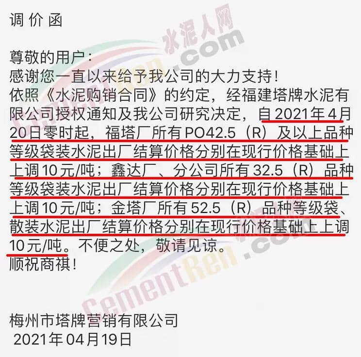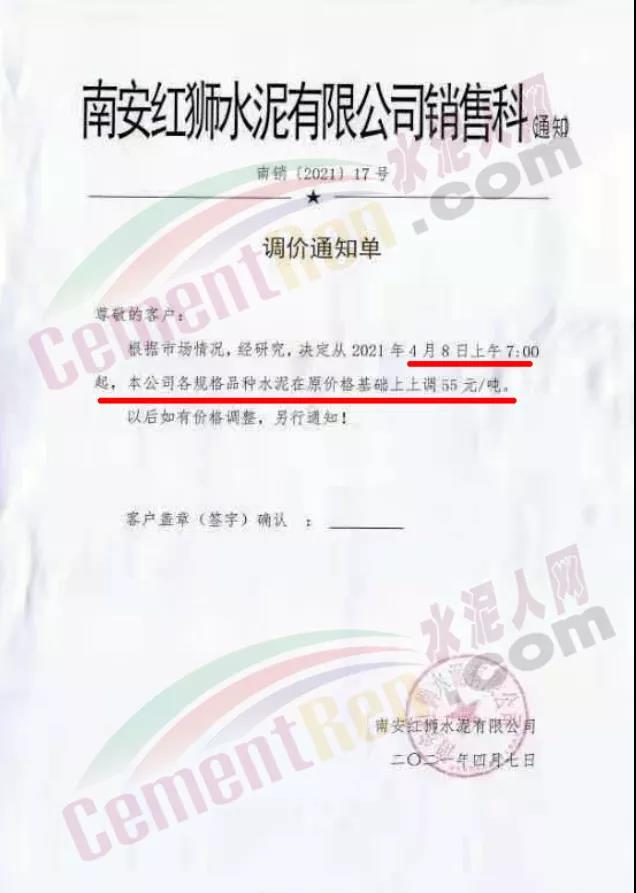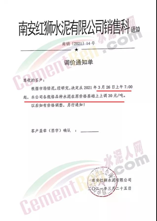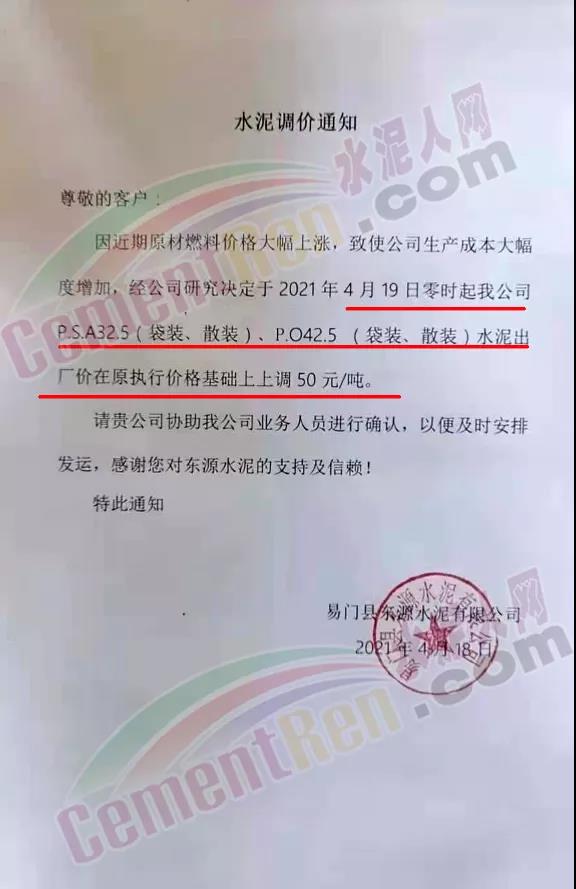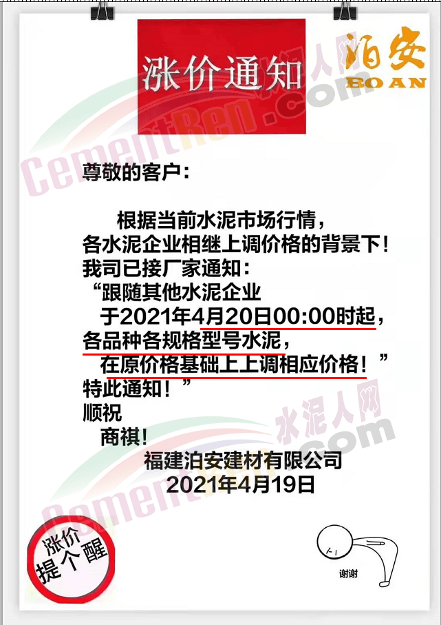 福建泊安建材通知,根據(jù)當(dāng)前水泥市場行情,各水泥企業(yè)相繼上調(diào)價格的背景下,公司已接廠家通知∶“跟隨其他水泥企業(yè)于2021年4月20日0時起,各品種各規(guī)格型號水泥,在原價格基礎(chǔ)上上調(diào)相應(yīng)價格!”