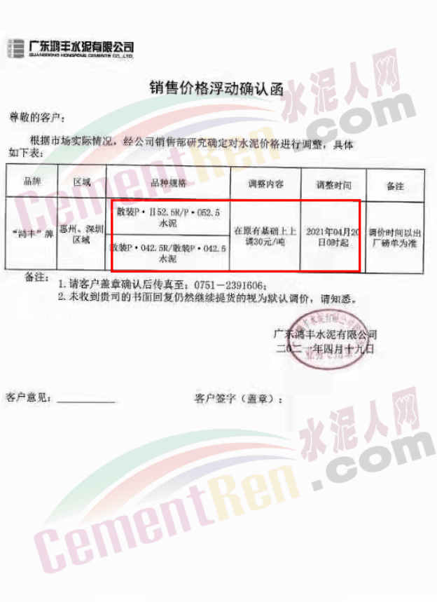廣東鴻豐水泥有限公司通知自4月20日零時起,惠州、深圳區(qū)域P.II52.5R/P.O52.5和P.O42.5R/P.O42.5散裝水泥在原有基礎(chǔ)上上調(diào)30元/噸。