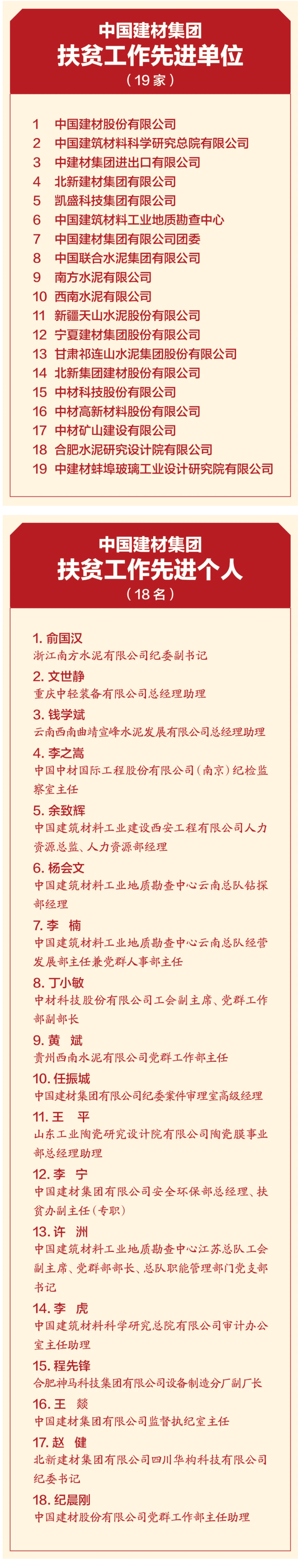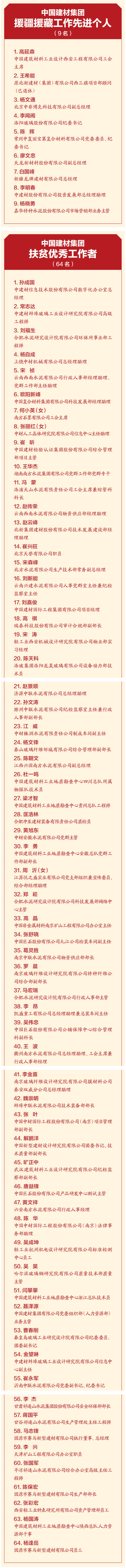 曹江林宣讀表彰決定,黨的十八大以來,集全集團之力,盡銳出戰(zhàn)、合力攻堅。2020年我國脫貧攻堅戰(zhàn)取得了全面勝利,區(qū)域性整體貧困得到解決,完成了消除絕對貧困的艱巨任務(wù)。集團定點幫扶的五個縣區(qū)已脫貧出列,援疆援藏工作也取得了階段性成果。為表彰在脫貧攻堅及援疆援藏工作中涌現(xiàn)出的先進個人和先進集體,充分展現(xiàn)脫貧攻堅成效成果,經(jīng)集團黨委研究決定:授予中國建材股份有限公司等19家成員企業(yè)“扶貧工作先進單位”稱號,授予俞國漢等18名同志“扶貧工作先進個人”稱號,授予高延森等9名同志“援疆援藏工作先進個人”稱號,授予孫成國等64名同志“扶貧優(yōu)秀工作者”稱號。