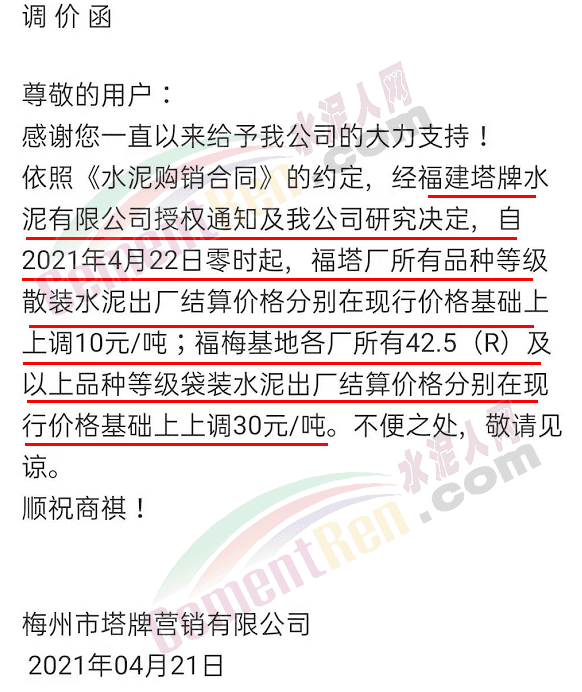 水泥人網(wǎng)通訊員消息 :4月21日梅州市塔牌營銷有限公司再一發(fā)函漲價。漲價通知稱,依照《水泥購銷合同》的約定,經(jīng)福建塔牌水泥有限公司授權通知及公司研究決定,自 2021年4月22日零時起,福塔廠所有品種等級散裝水泥出廠結(jié)算價格分別在現(xiàn)行價格基礎上上調(diào)10元/噸;福梅基地各廠所有42.5(R)及以上品種等級袋裝水泥出廠結(jié)算價格分別在現(xiàn)行價格基礎上上調(diào)30元/噸。據(jù)水泥人網(wǎng)了解,這已經(jīng)是該企業(yè)近一個月內(nèi)發(fā)布的第9份漲價函了。
