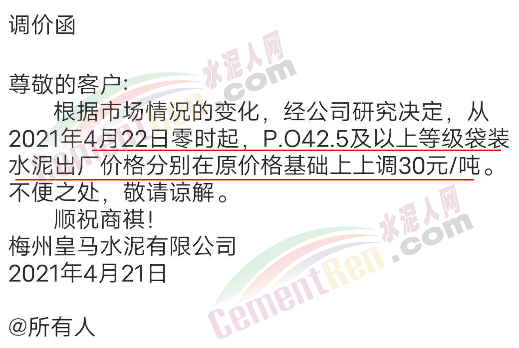 4月21日梅州皇馬水泥有限公司通知根據(jù)市場情況的變化,經(jīng)公司研究決定,從 2021年4月22日零時起,P.O42.5及以上等級袋裝水泥出廠價格分別在原價格基礎上上調(diào)30元/噸。