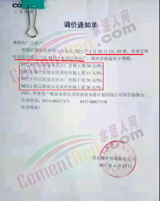 南京海中貿(mào)易有限公司通知自4月20日12時起,對南京海中貿(mào)易有限公司 M32.5水泥品種出廠、離岸價上調(diào)15-20元/噸。