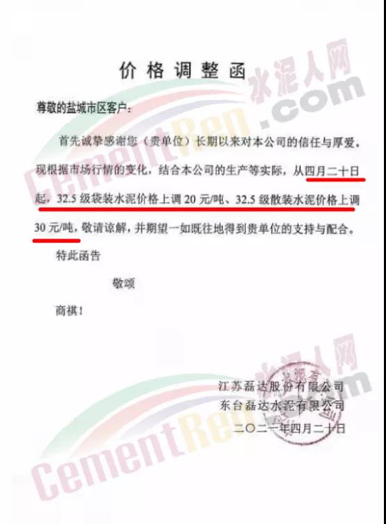 江蘇磊達股份有限公司東臺磊達水泥有限公司通知從4月20日起,32.5級袋裝水泥價格上調(diào) 20元/噸,散裝水泥上調(diào)30元/噸。