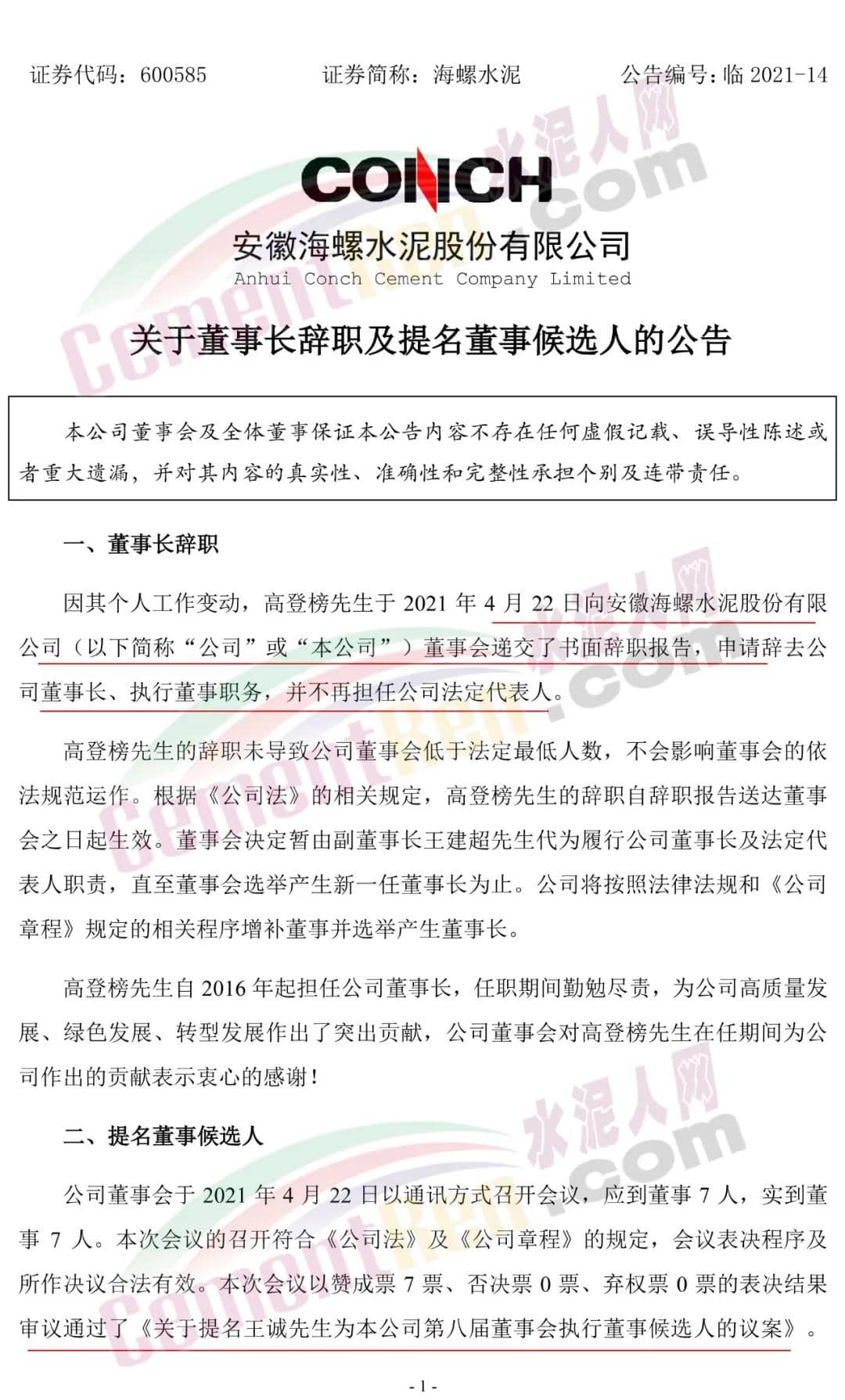 日前,海螺水泥上市公司發(fā)布《 關(guān)于董事長辭職及提名董事候選人的公告 》稱,因其個人工作變動,高登榜先生于 2021 年 4 月 22 日向安徽海螺水泥股份有限公司董事會遞交了書面辭職報告,申請辭去公司董事長、執(zhí)行董事職務(wù),并不再擔任公司法定代表人。