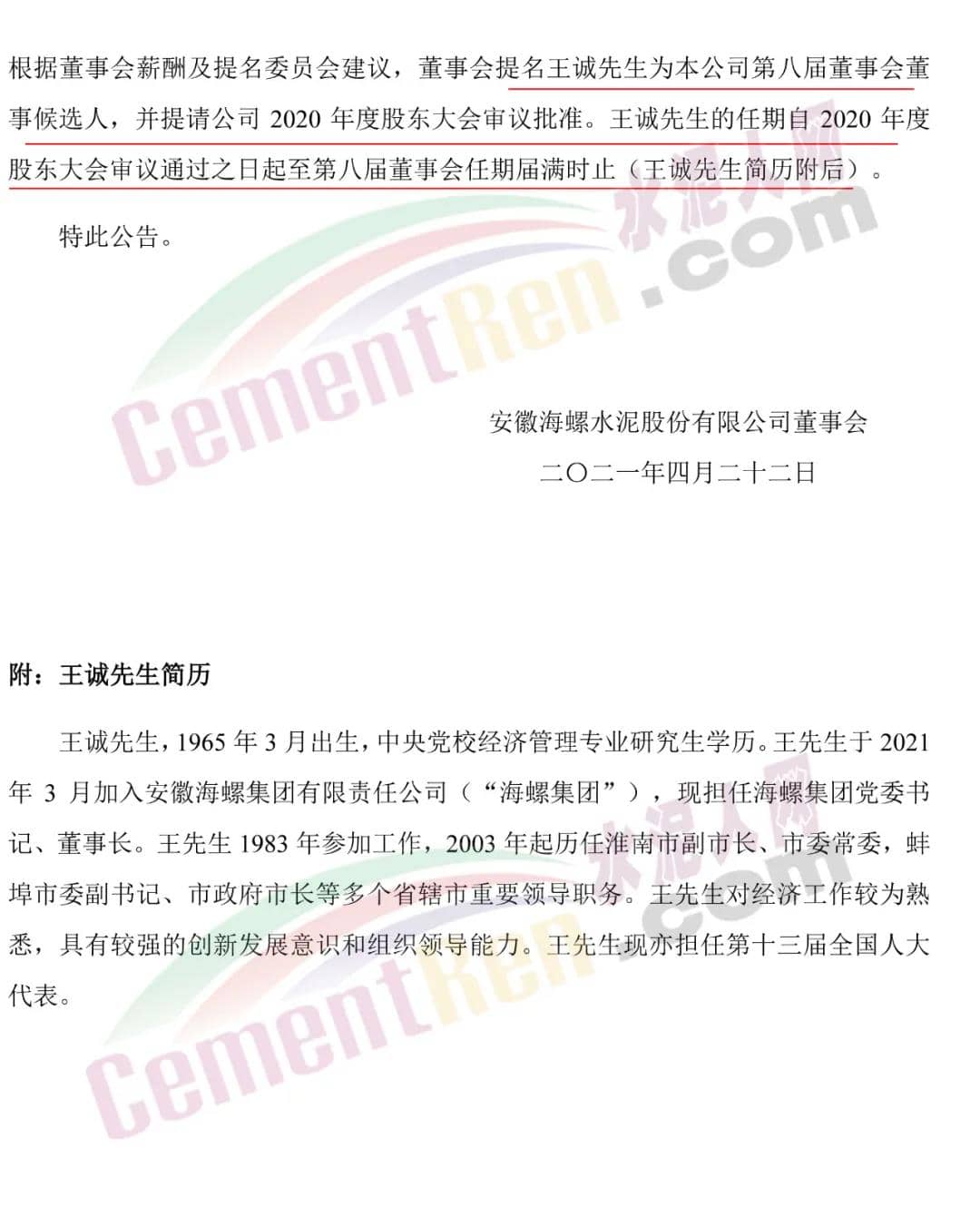 王先生于 2021年 3 月加入安徽海螺集團有限責任公司(“海螺集團”),現(xiàn)擔任海螺集團黨委書記、董事長。