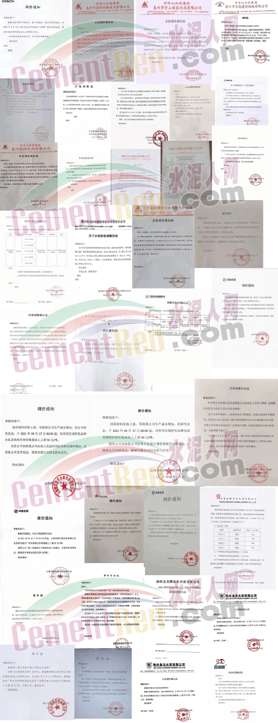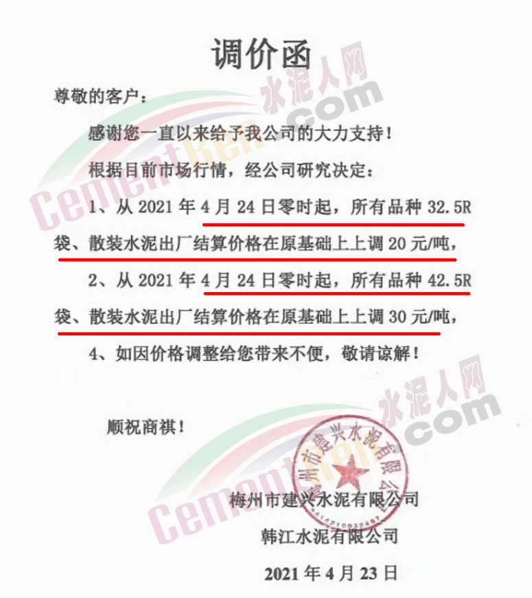 梅州皇馬水泥有限公司通知,從2021年4月24日零時(shí)起,P.O42.5及以上等級(jí)袋裝水泥出廠單價(jià)分別在原價(jià)格基礎(chǔ)上上調(diào)30元/噸;P.O42.5及以上等級(jí)散裝水泥出廠單價(jià)分別在原價(jià)格基礎(chǔ)上上調(diào)40元/噸。