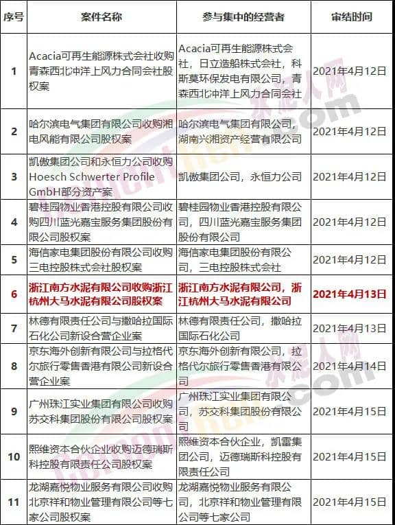 2021年4月12日-4月18日無條件批準經(jīng)營者集中案件列表