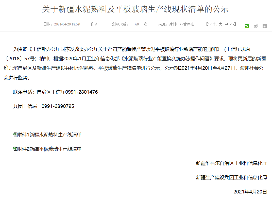日前,新疆維吾爾自治區(qū)工信廳發(fā)布了關(guān)于新疆水泥熟料及平板玻璃生產(chǎn)線現(xiàn)狀清單的公示。公告顯示,截至2020年12月31日,新疆自治區(qū)共有水泥熟料生產(chǎn)線77條。