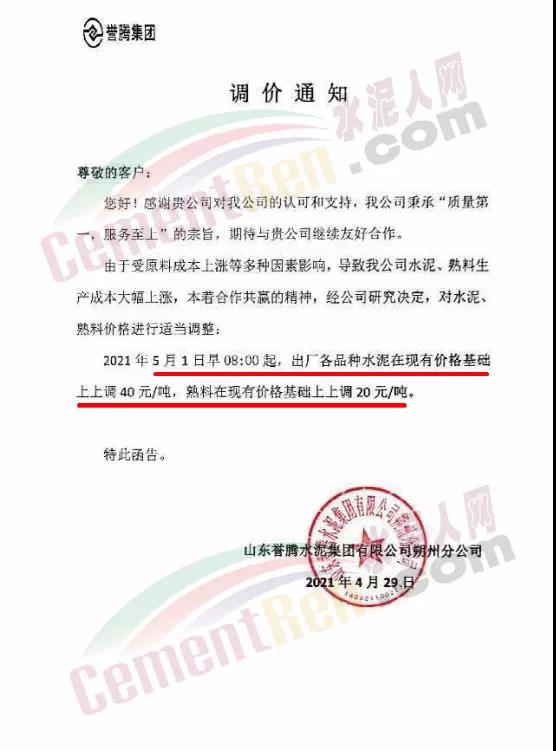 山東譽(yù)騰水泥集團(tuán)有限公司朔州分公司通知由于受原料成本上漲等多種因素影響,導(dǎo)致公司水泥、熟料生產(chǎn)成本大幅上漲,本著合作共贏的精神,經(jīng)公司研究決定,對(duì)水泥、熟料價(jià)格進(jìn)行適當(dāng)調(diào)整。自2021年5月1日早08時(shí)起,出廠各品種水泥在現(xiàn)有價(jià)格基礎(chǔ)上上調(diào)40元/噸,熟料在現(xiàn)有價(jià)格基礎(chǔ)上上調(diào)20元/噸。