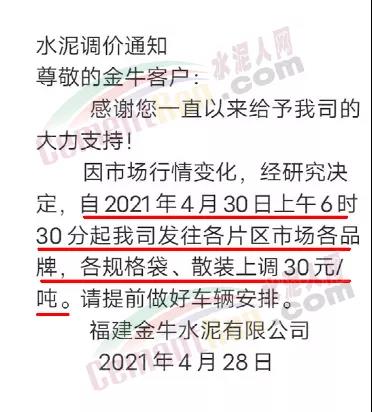 福建金牛水泥有限公司通知自2021年4月30日上午6時(shí)30分起公司發(fā)往各片區(qū)市場(chǎng)各品牌,各規(guī)格袋、散裝上調(diào)30元/噸。