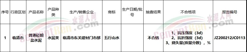 同期,山東省聊城市市場監(jiān)督管理局發(fā)布 《2020年第六批工業(yè)產(chǎn)品質(zhì)量市級監(jiān)督抽查結(jié)果》稱,根據(jù)《聊城市市場監(jiān)督管理局關(guān)于組織開展2020年第六批工業(yè)產(chǎn)品質(zhì)量監(jiān)督抽查工作的通知》(聊市監(jiān)便字〔2020〕169號)要求,將監(jiān)督抽查結(jié)果予以公布。其中,水泥產(chǎn)品一個批次不合格,來自于流通領(lǐng)域。銷售企業(yè)為臨清市東關(guān)建材門市部。不合格項目為1、抗壓強度(3d)2、抗折強度(3d)3、燒失量。不合格商標為“五行山水”。