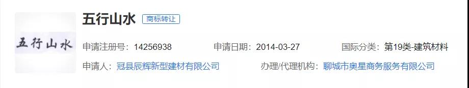 據(jù)查詢“五行山水”商標申請人為冠縣辰輝新型建材有限公司(生產(chǎn)許可證編號XK08-001-05728),企業(yè)同時擁有“五行山水,盤龍山、辰輝中岳”三個注冊商標,且全部為建材材料類商標。