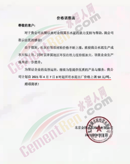 天津天瑞水泥有限公司通知,近期受環(huán)保及運(yùn)輸管制等因素影響,原材料緊缺且價(jià)格上漲,致使公司生產(chǎn)成本不斷提高,為保證正常生產(chǎn)經(jīng)營,經(jīng)研究決定自2021年5月8日8時(shí)起,對(duì)各品種水泥出廠價(jià)在原執(zhí)行價(jià)基礎(chǔ)上上調(diào) 40元/噸。