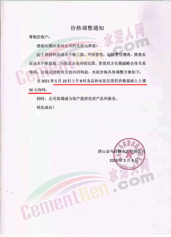 唐山金馬啟新水泥有限公司通知由于原材料的成本不斷上漲,環(huán)保管控,運(yùn)輸費(fèi)用增高,致使水泥成本不斷提高。自2021年5月10日上午8時(shí)各品種水泥在原有價(jià)格基礎(chǔ)上上調(diào)50元/噸。4月30日曾上調(diào)30元/噸,兩次累計(jì)上調(diào)80元/噸。