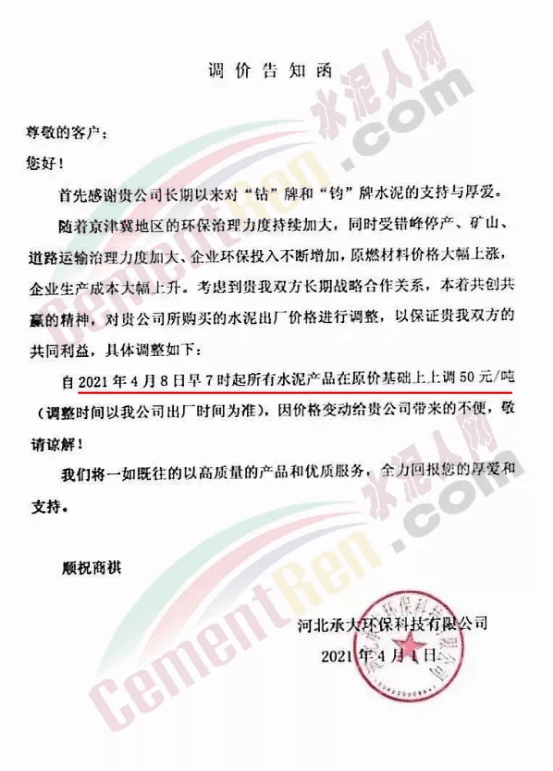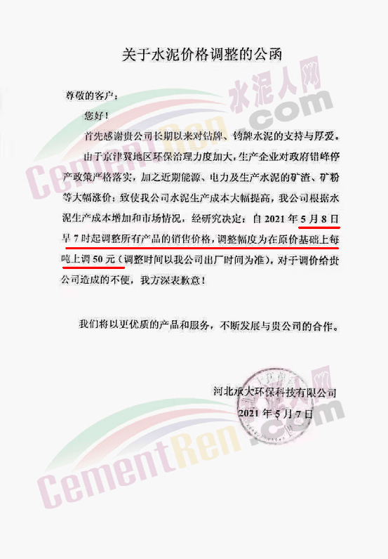 河北承大環(huán)保科技有限公司通知:由于京津冀地區(qū)環(huán)保治理力度加大,生產(chǎn)企業(yè)對(duì)政府錯(cuò)峰停產(chǎn)政策嚴(yán)格落實(shí),加之近期能源、電力及生產(chǎn)水泥的礦渣、礦粉等大幅漲價(jià);致使公司水泥生產(chǎn)成本大幅提高,公司根據(jù)水泥生產(chǎn)成本增加和市場(chǎng)情況,經(jīng)研究決定,自2021年5月8日早7時(shí)起調(diào)整所有產(chǎn)品的銷售價(jià)格,調(diào)整幅度為在原價(jià)基礎(chǔ)上上調(diào)50元/噸。4月1日也曾上調(diào)50元/噸,兩次累計(jì)上調(diào)100元/噸。