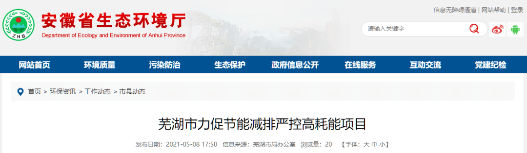 日前,水泥人網(wǎng)自安徽省生態(tài)環(huán)境廳獲悉,近日,蕪湖市2019至2020年新增10個高耗能項目均通過省發(fā)改委合理用能評估。