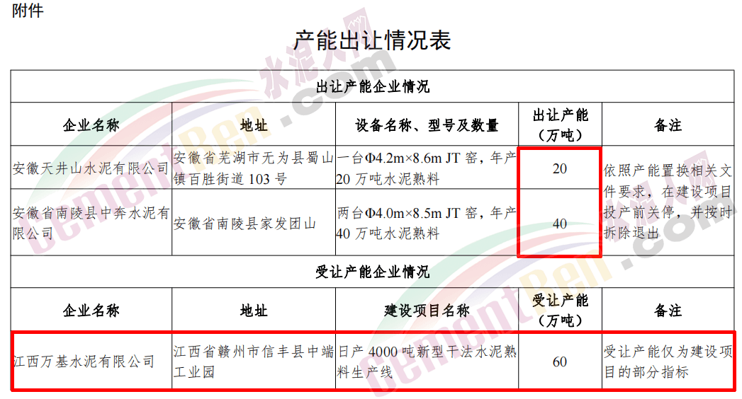 據(jù)水泥人網(wǎng)了解,2019年1月30日安徽省工信廳曾發(fā)布安徽天井山水泥有限公司和安徽省南陵縣中奔水泥有限公司水泥熟料生產(chǎn)線產(chǎn)能出讓的公告。產(chǎn)能出讓情況表顯示,安徽天井山水泥一條水泥熟料生產(chǎn)線和安徽南陵縣中奔水泥兩條水泥熟料生產(chǎn)線產(chǎn)能退出產(chǎn)能為三臺JT窯年產(chǎn)能合計60萬噸。用于江西萬基水泥有限公司建設(shè)一條4000t/d水泥熟料生產(chǎn)線。
