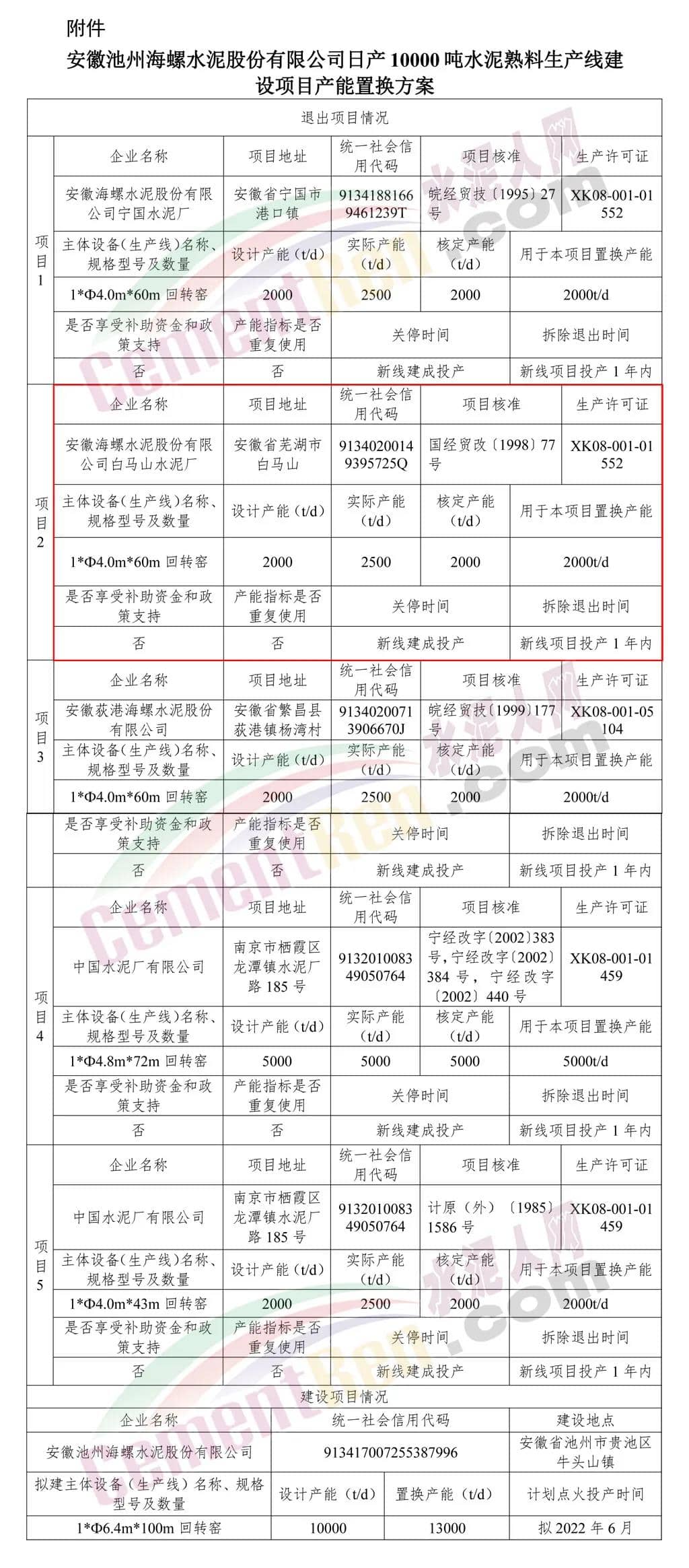 2020年7月,安徽省工信廳發(fā)布的一則產(chǎn)能置換方案中提到海螺水泥將通過退出包括安徽省蕪湖市的海螺水泥白馬山水泥廠2000t/d熟料生產(chǎn)線在內(nèi)的5個項目,用于在池州市境內(nèi)新建一條10000t/d熟料生產(chǎn)線。退出項目將在新線建成投產(chǎn)前關(guān)停,并于新線項目投產(chǎn)1年內(nèi)拆除。