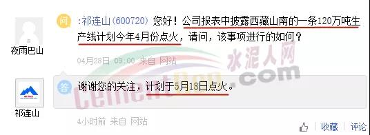 祁連山水泥5月12日在投資者互動平臺回復(fù)稱:謝謝您的關(guān)注,計劃于5月18日點火。