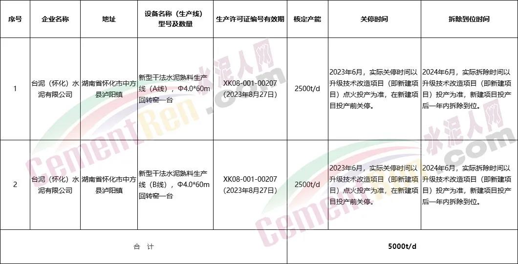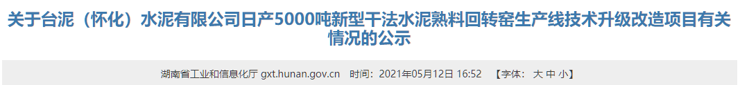 5月12日湖南省工信廳發(fā)布《關(guān)于臺泥(懷化)水泥有限公司日產(chǎn)5000噸新型干法水泥熟料回轉(zhuǎn)窯生產(chǎn)線技術(shù)升級改造項目有關(guān)情況的公示》稱,臺泥(懷化)水泥有限公司擬在原廠區(qū)內(nèi)實施智能化升級技術(shù)改造“合二為一”,建設(shè)一條日產(chǎn)5000噸新型干法水泥熟料回轉(zhuǎn)窯生產(chǎn)線,并將于2023年6月投產(chǎn)。
