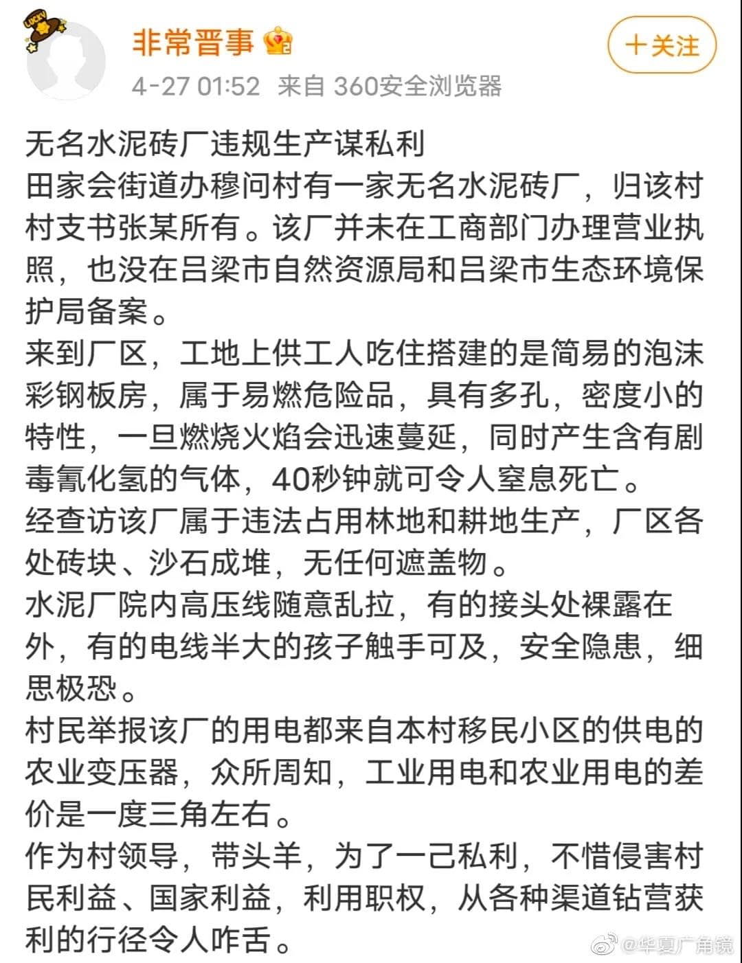 田家會街道辦穆問村有一家無名水泥磚廠,歸該村村支書張某所有。該廠并未在工商部門辦理營業(yè)執(zhí)照,也沒在呂梁市自然資源局和呂梁市生態(tài)環(huán)境保護局備案。