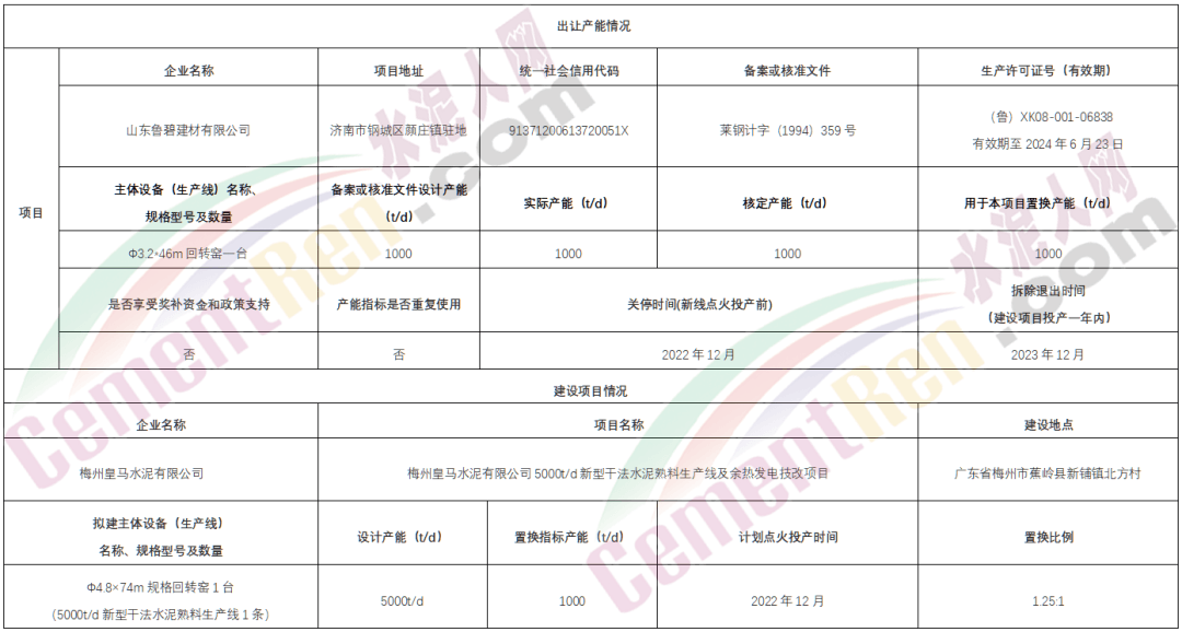 據(jù)水泥人網(wǎng)此前報道,山東省濟南市山東魯碧建材有限公司擬將該公司位于濟南市鋼城區(qū)的一條1000t/d水泥熟料生產(chǎn)線的產(chǎn)能轉讓給省外企業(yè)梅州皇馬水泥有限公司。用于在廣東省梅州市蕉嶺縣新鋪鎮(zhèn)北方村新建一條5000t/d新型干法水泥熟料生產(chǎn)線。 新建生產(chǎn)線或將于2022年12月點火投產(chǎn)。